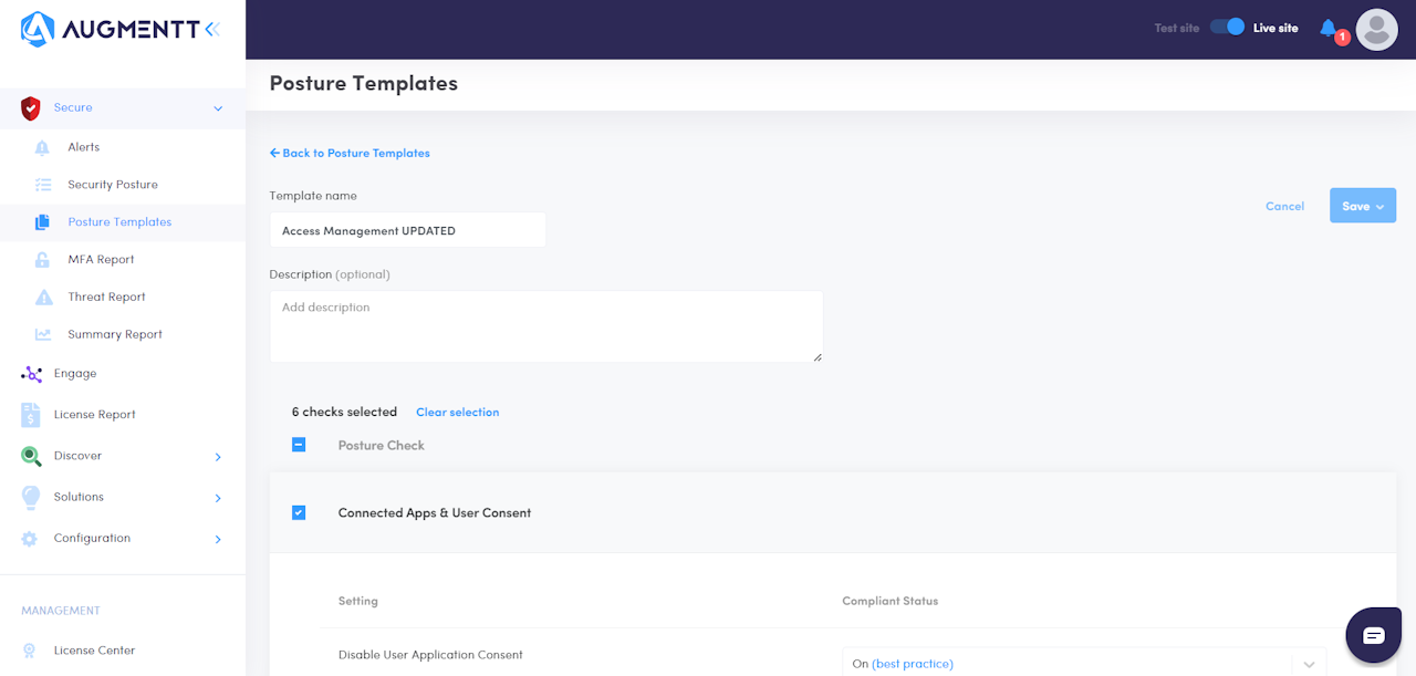 If you would like to build your own template from scratch, you can do that too, just click the Create New button on the top right-hand corner of the Posture Templates page. That will open a new blank template: you can name your template, add a description, and select which of the 15 posture checks you would like to run. Once you are done, you can click the Save Template button in the top right-hand corner.