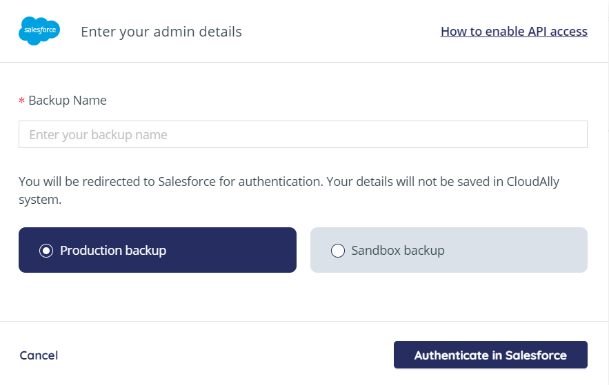 Perform the following procedure in the CloudAlly web application to create a Salesforce backup: