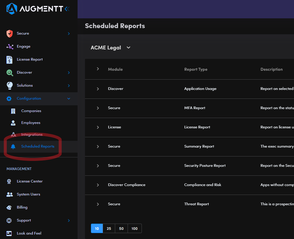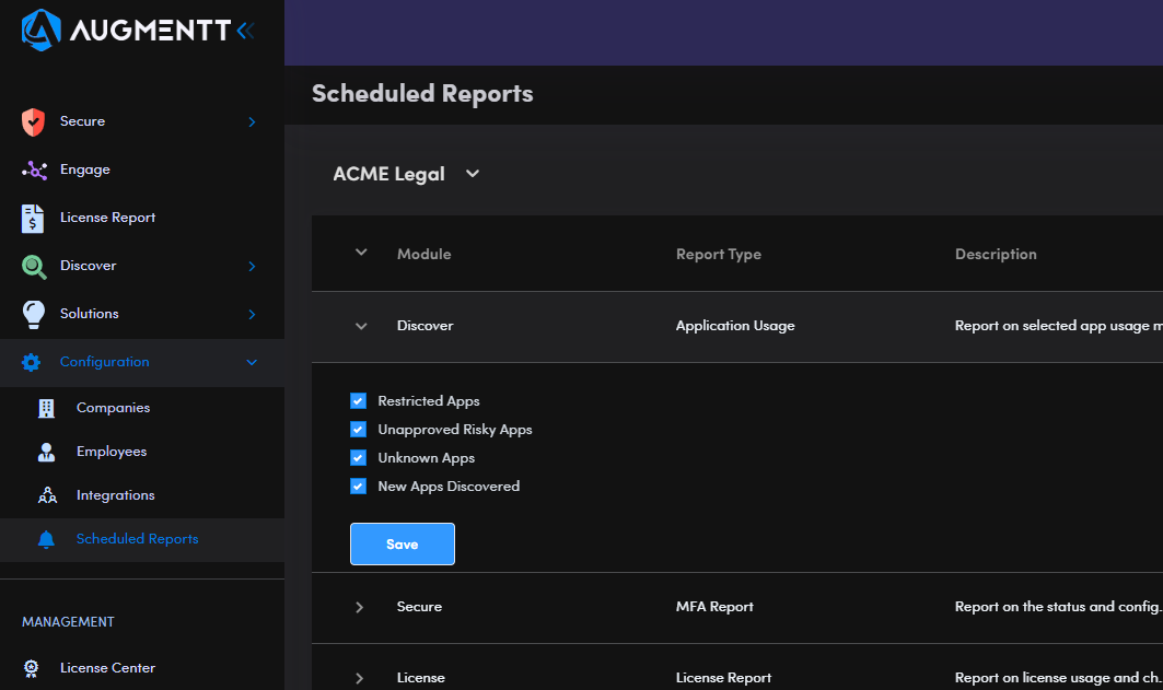 Scheduled Reports allow users to automatically receive information from three modules of the Augmentt portal. This information, including the security status of integrated tenants, can be set for delivery without having to log in.