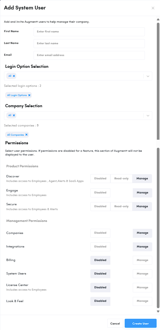 Admins of the Augmentt platform are called System Users. System Users can be created with combinations of Permissions and Customer Access.
